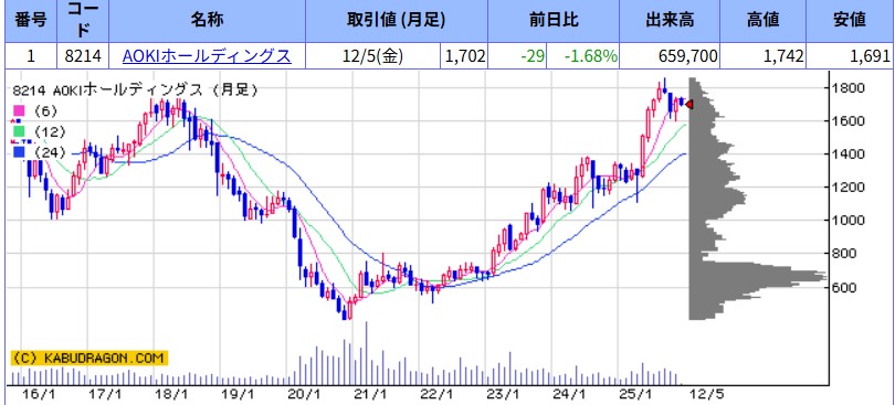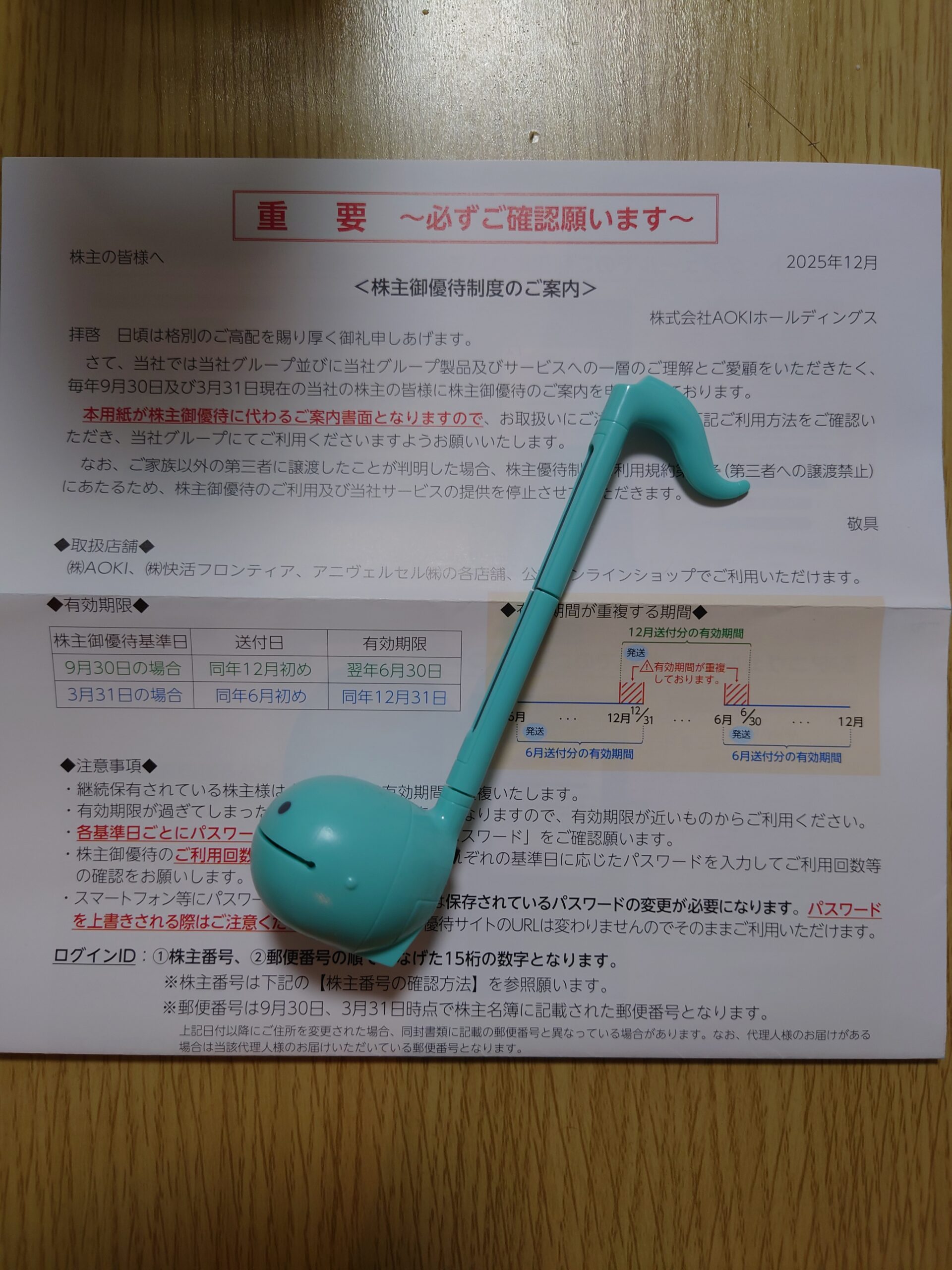 AOKI(証券コード8214)から株主優待が届きましたので、本ブログで優待情報や株価を紹介します